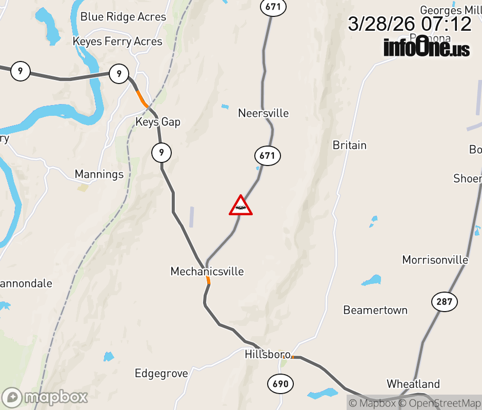 On Rt. 671 in the County of Loudoun, in the vicinity of Kidwell Rd; Rt. 787E/W (Loudoun County), motorists can expect delays due to a vehicle crash. All north lanes are closed. Updated: Sat 3/28/26 7:12 AM EDT ![]() Updated: Sat 3/28/26 7:12 AM EDT |