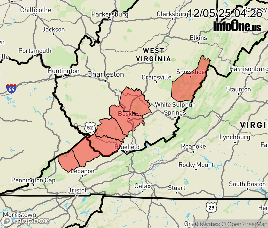 Canceled 12/5/25 9:49 AM Winter Weather Advisory issued December 5 at 4:24AM EST until December 5 at 10:00AM EST by NWS Charleston WV * WHAT... Snow. Additional snow accumulations up to one inch. * WHERE... Portions of southwest Virginia and northeast, southeast, and southern West Virginia. * WHEN... Until 10 AM EST this morning. * IMPACTS... Plan on slippery road conditions. The hazardous conditions could impact the Friday morning commute. ![]() |