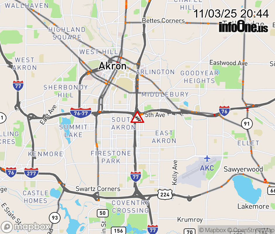 All lanes are blocked on Ramp I-77 North to I-76 East, due to repairs/maintenance. ![]() |