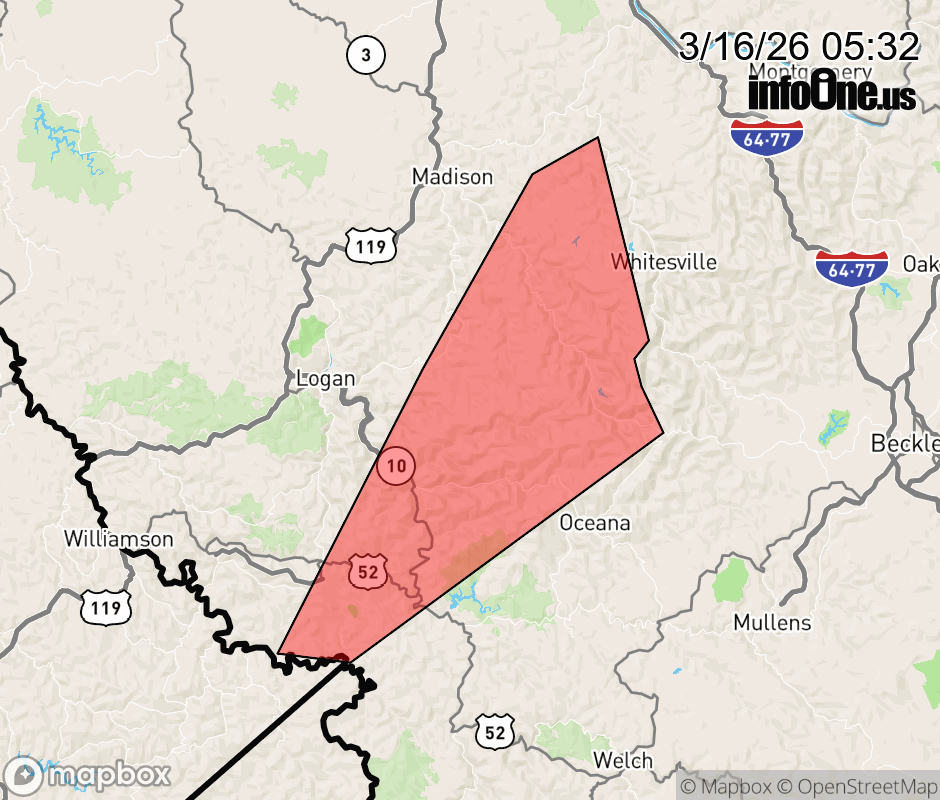 Canceled 3/16/26 5:43 AM Severe Thunderstorm Warning issued March 16 at 5:31AM EDT until March 16 at 5:45AM EDT by NWS Charleston WV At 531 AM EDT, severe thunderstorms were located along a line extending from 7 miles east of Madison to near Van to near Amherstdale-Robinette to near Gilbert Creek, moving northeast at 50 mph. HAZARD...60 mph wind gusts. SOURCE...Radar indicated. IMPACT...Expect damage to roofs, siding, and trees. Locations impacted include... Man, Van, Mallory, Amherstdale-Robinette, Wharton, Hinch, Bald Knob, Gilbert Creek, Gilbert, Seth, Cyclone, Prenter, Hampden, Bruno, Blair, and Amherstdale-Robine. ![]() |