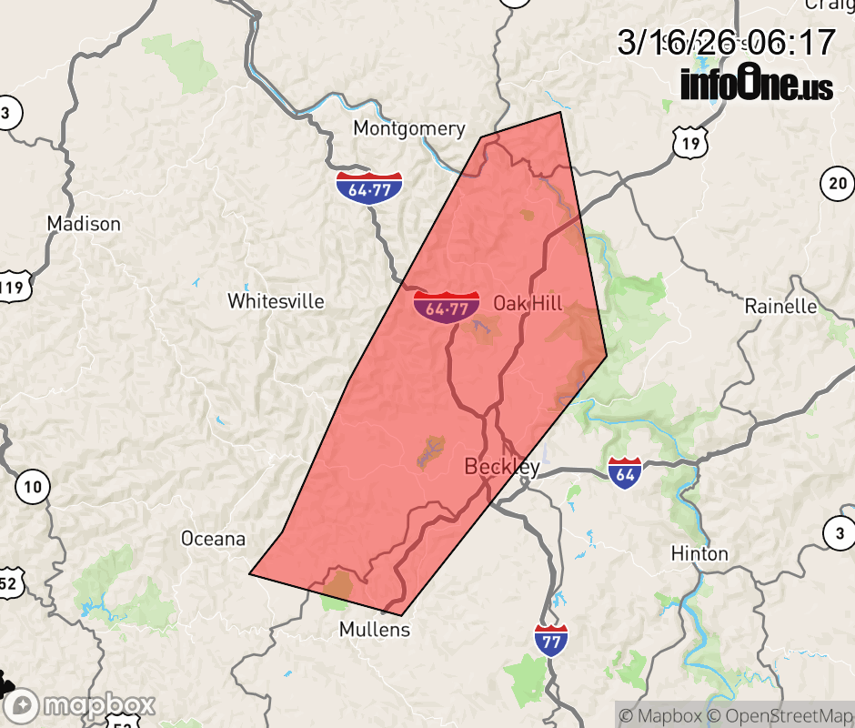 Canceled 3/16/26 6:25 AM Severe Thunderstorm Warning issued March 16 at 6:16AM EDT until March 16 at 6:30AM EDT by NWS Charleston WV At 616 AM EDT, severe thunderstorms were located along a line extending from near Hawks Nest State Park to 6 miles west of Bradley to Twin Falls State Park, moving east at 30 mph. HAZARD...60 mph wind gusts. SOURCE...Radar indicated. IMPACT...Expect damage to roofs, siding, and trees. Locations impacted include... Beckley, Fayetteville, Oak Hill, Mount Hope, Mabscott, Ansted, Sophia, Gauley Bridge, Crab Orchard, Dry Creek, Macarthur, Bradley, Hawks Nest State Park, Piney View, Stanaford, Prosperity, Twin Falls State Park, Powellton, Lester, and Pax. ![]() |