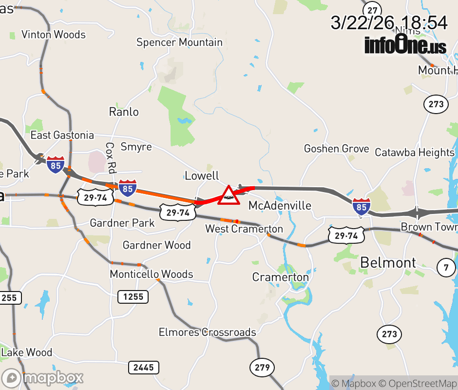 The right shoulder is closed near Exit 23 (McAdenville Road). Updated: Sun 3/22/26 6:54 PM EDT ![]() Updated: Sun 3/22/26 6:54 PM EDT |
