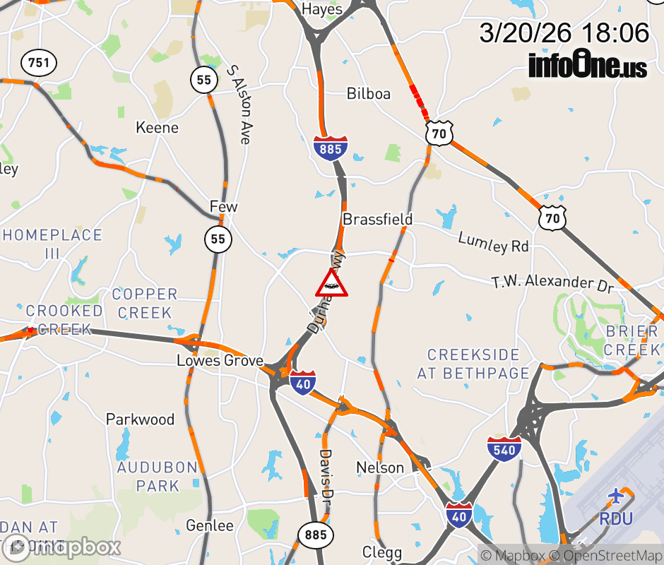 The right shoulder is closed before Exit 7 (T W Alexander). Updated: Fri 3/20/26 6:06 PM EDT ![]() Updated: Fri 3/20/26 6:06 PM EDT |