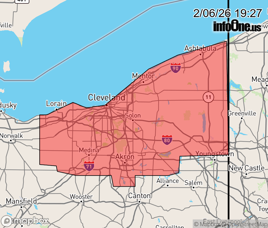 Canceled 2/6/26 8:45 PM Special Weather Statement issued February 6 at 7:26PM EST by NWS Cleveland OH At 722 PM EST, radar indicated expanding snow showers across the region. This included a heavier band extending from 9 miles southeast of Ashtabula to near Chesterland to near Lakewood, moving southeast at 40 mph. HAZARDS INCLUDE... Winds to 40 mph... Visibility dropping to less than three quarters of a mile... Locally up to 2 inches of quick snow accumulation with the highest across the snowbelt east of Cleveland... Motorists traveling on Interstates 77, 90, 271, 480, and 80 should use caution and slow down as snow increases. Locations impacted include... Cleveland, Akron, Lorain, Elyria, Warren, Medina, Painesville, Ashtabula, Willowick, Conneaut, Ravenna, Vermilion, Chardon, Fairport Harbor, Geneva-On-The-Lake, Parma, Lakewood, Cuyahoga Falls, Euclid, and Mentor. Use extra caution if you must travel. Rapid changes in visibility and potentially slick roads may lead to accidents. ![]() |