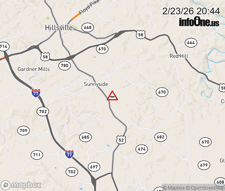On Rt. 926 North in the County of Carroll, in the vicinity of Bluestone Rd; Rt. 676N/S (Carroll County), motorists can expect delays due to a vehicle crash. Lane closures exist. Updated: Mon 2/23/26 8:44 PM EST ![]() Updated: Mon 2/23/26 8:44 PM EST |