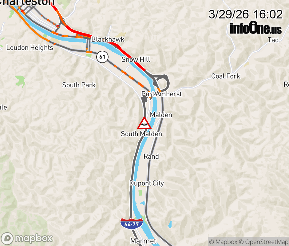 Vehicle Crash on WV-61 (6700 Blk MacCorkle Ave). The eastbound road is closed. The westbound road is closed. Updated: Sun 3/29/26 4:02 PM EDT ![]() Updated: Sun 3/29/26 4:02 PM EDT |