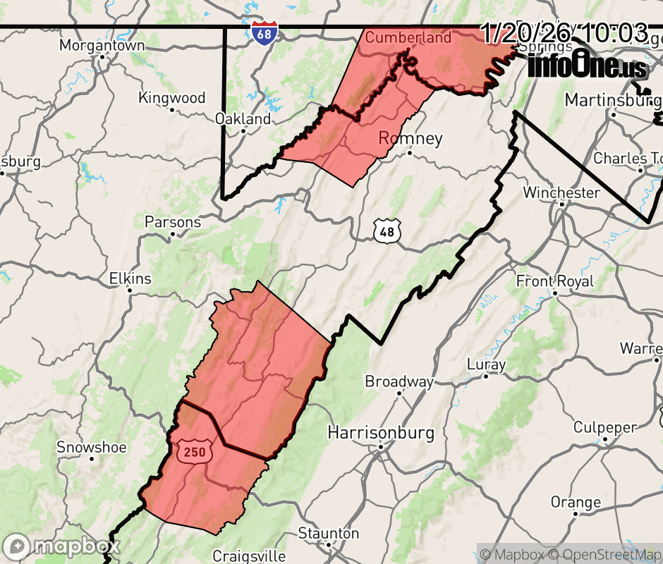 Canceled 1/20/26 1:00 PM Cold Weather Advisory issued January 20 at 10:01AM EST until January 20 at 1:00PM EST by NWS Baltimore MD/Washington DC * WHAT... Very cold wind chills as low as 15 below. * WHERE... In Maryland, Eastern Garrett and Extreme Western Allegany Counties. In Virginia, Eastern Highland County. In West Virginia, Eastern Pendleton and Western Mineral Counties. * WHEN... Until 1 PM EST this afternoon. * IMPACTS... The cold wind chills as low as 20 below zero could result in hypothermia if precautions are not taken. Wind chill values can lead to hypothermia with prolonged exposure. ![]() |