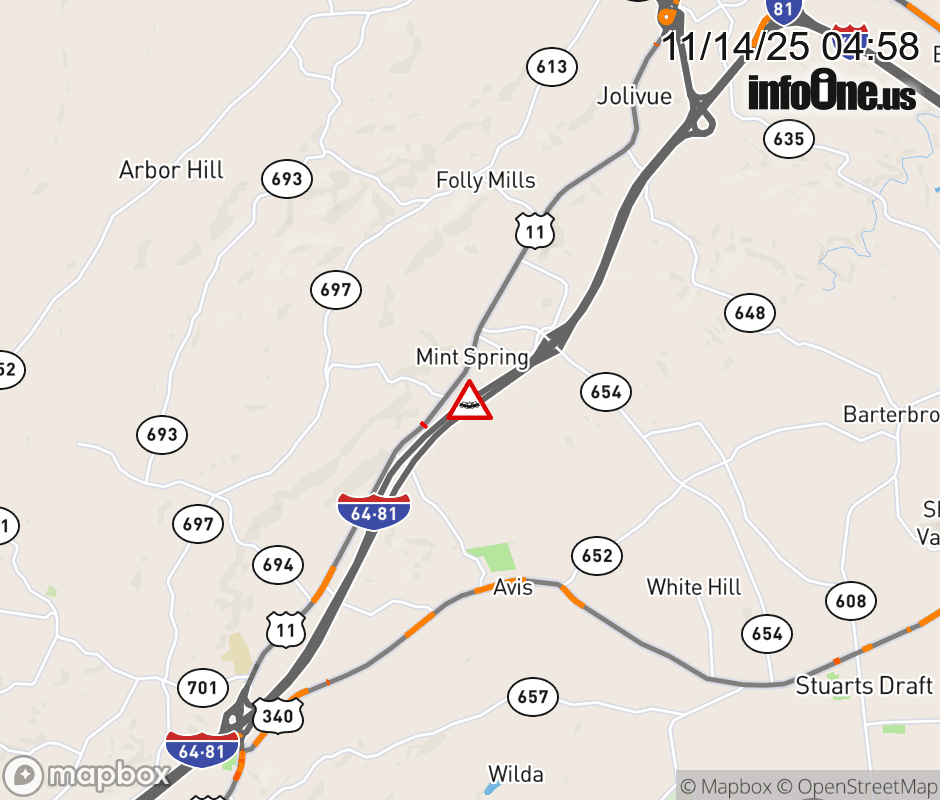 On I-81 at mile marker 217 in the County of Augusta, motorists can expect delays due to a tractor trailer crash. The south right shoulder is closed. Updated: Fri 11/14/25 4:58 AM EST ![]() Updated: Fri 11/14/25 4:58 AM EST |