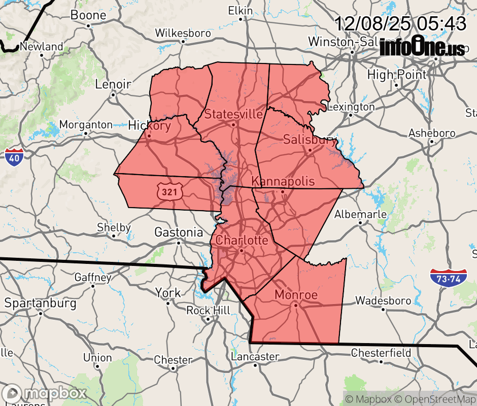 Canceled 12/8/25 7:00 AM Dense Fog Advisory issued December 8 at 5:42AM EST until December 8 at 7:00AM EST by NWS Greenville-Spartanburg SC * WHAT... Visibility one quarter mile or less in dense fog. * WHERE... Alexander, Cabarrus, Catawba, Davie, Iredell, Lincoln, Mecklenburg, Rowan, and Union Counties. * WHEN... Until 7 AM EST this morning. * IMPACTS... Low visibility could make driving conditions hazardous. ![]() |