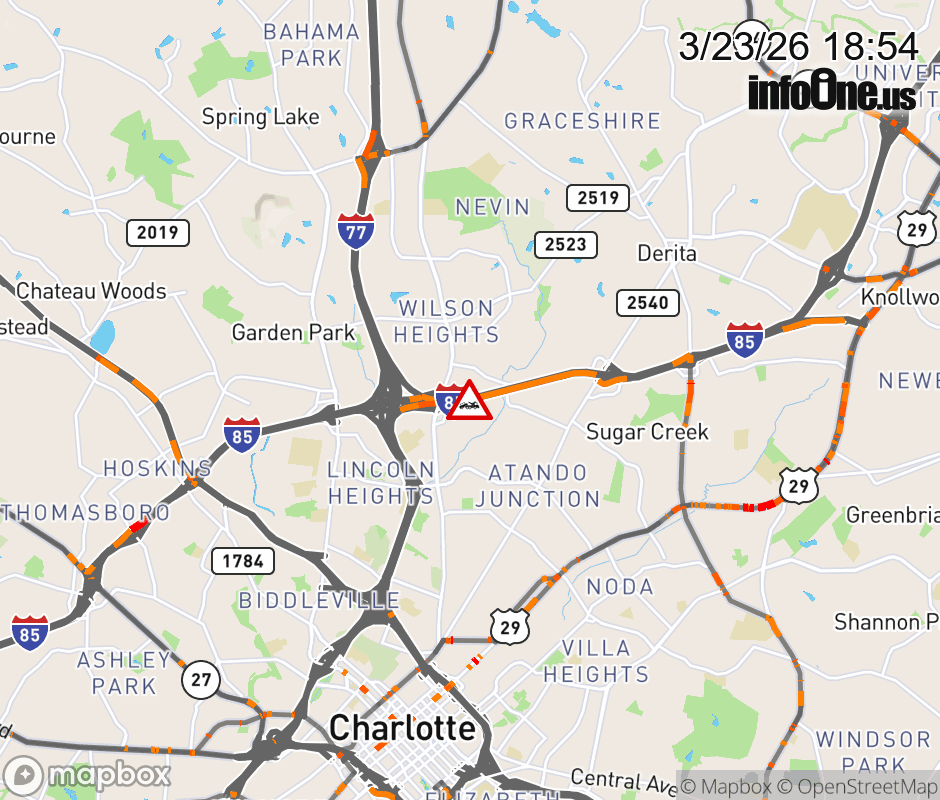 The left shoulder is closed past Exit 39 (Statesville Ave). Updated: Mon 3/23/26 6:54 PM EDT ![]() Updated: Mon 3/23/26 6:54 PM EDT |