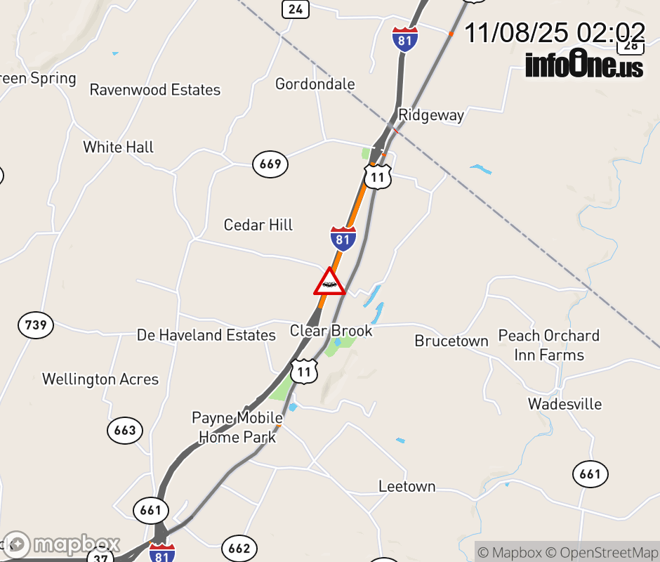 On I-81 at mile marker 322 in the County of Frederick, motorists can expect delays due to a tractor trailer crash. The north left shoulder and left lane are closed. Updated: Sat 11/8/25 2:02 AM EST ![]() Updated: Sat 11/8/25 2:02 AM EST |