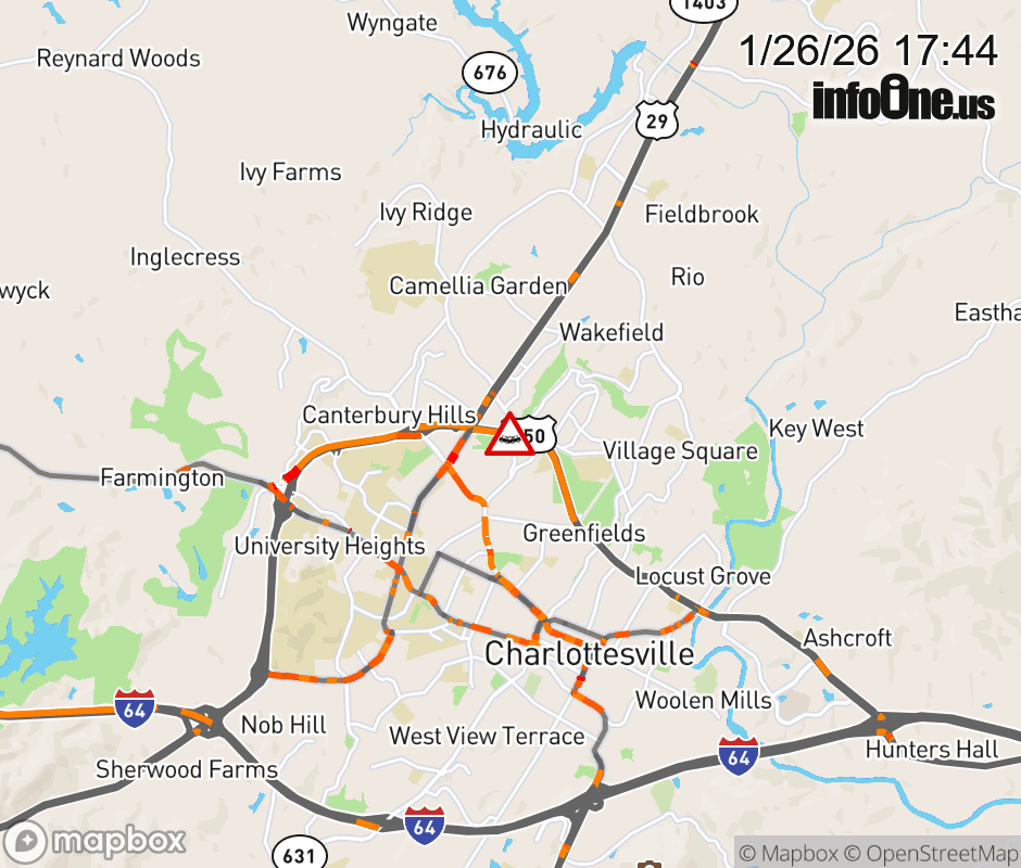 On US-250 East in the City of Charlottesville, in the vicinity of Hydraulic Rd; Rugby Rd; City Rt. 3431N/S (City of Charlottesville), motorists can expect delays due to a vehicle crash. Lane closures exist. ![]() |