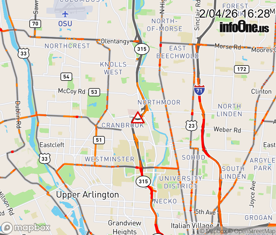The left shoulder is blocked on SR-315 North beyond N Broadway/Olentangy River Rd, due to a crash. ![]() |