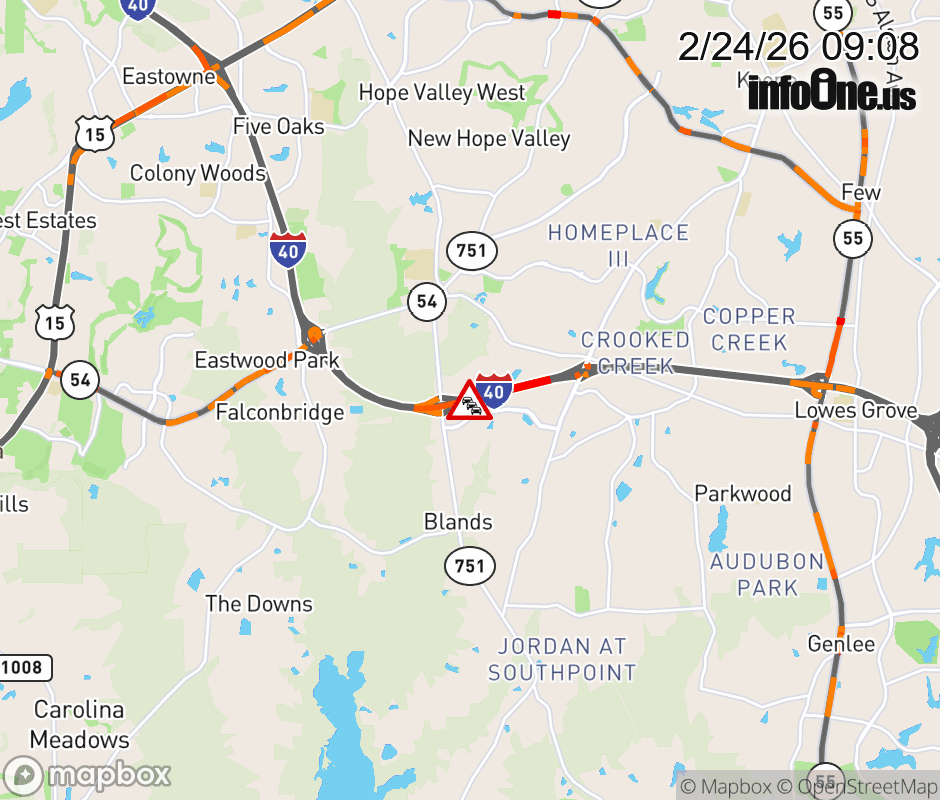 The right lane is closed at Exit 274 (NC 751). Updated: Tue 2/24/26 9:08 AM EST ![]() Updated: Tue 2/24/26 9:08 AM EST |