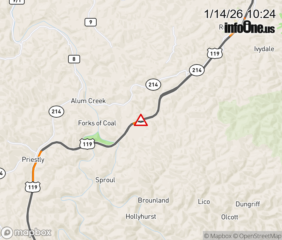 Vehicle Crash on US-119S (Alum Creek Rd). Updated: Wed 1/14/26 10:24 AM EST ![]() Updated: Wed 1/14/26 10:24 AM EST |