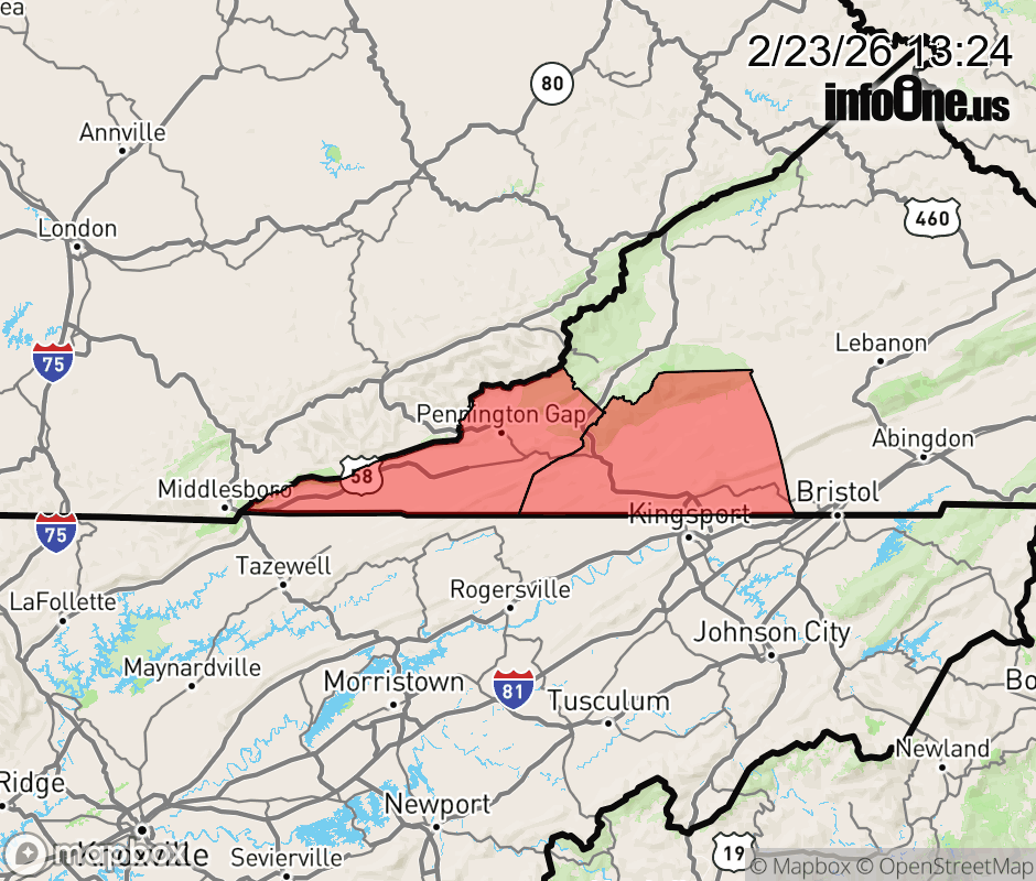 Canceled 2/24/26 12:00 AM Winter Weather Advisory issued February 23 at 1:22PM EST until February 24 at 12:00AM EST by NWS Morristown TN * WHAT... Occasional snow showers or flurries will continue through this evening. Snowfall of 1/2 to 2 inches have been reported. Additional snow accumulations of 1/2 to 1 inch is possible. * WHERE... Lee and Scott VA Counties. * WHEN... Until midnight EST tonight. * IMPACTS... Plan on slippery road conditions. The hazardous conditions could impact the Monday evening commute. ![]() |