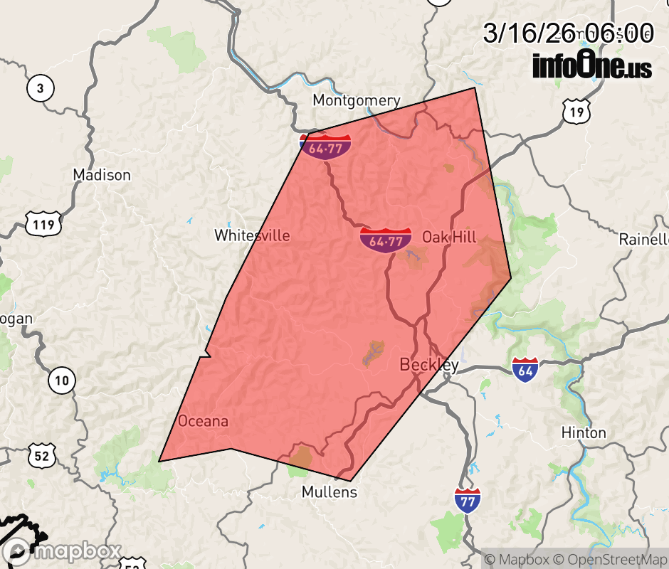 Canceled 3/16/26 6:17 AM Severe Thunderstorm Warning issued March 16 at 5:59AM EDT until March 16 at 6:30AM EDT by NWS Charleston WV At 559 AM EDT, severe thunderstorms were located along a line extending from near Powellton to 9 miles east of Bald Knob to near Oceana, moving east at 25 mph. HAZARD...60 mph wind gusts. SOURCE...Radar indicated. IMPACT...Expect damage to roofs, siding, and trees. Locations impacted include... Beckley, Fayetteville, Oak Hill, Mount Hope, Mabscott, Ansted, Oceana, Sophia, Gauley Bridge, Crab Orchard, Dry Creek, Macarthur, Bradley, Powellton, Hawks Nest State Park, Piney View, Stanaford, Prosperity, Burnwell, and Twin Falls State Park. ![]() |
