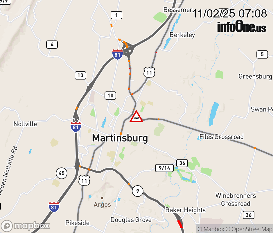 Vehicle Crash on WV-45 (E Molar Ave) & N High St in Martinsburg. Updated: Sun 11/2/25 7:08 AM EST ![]() Updated: Sun 11/2/25 7:08 AM EST |