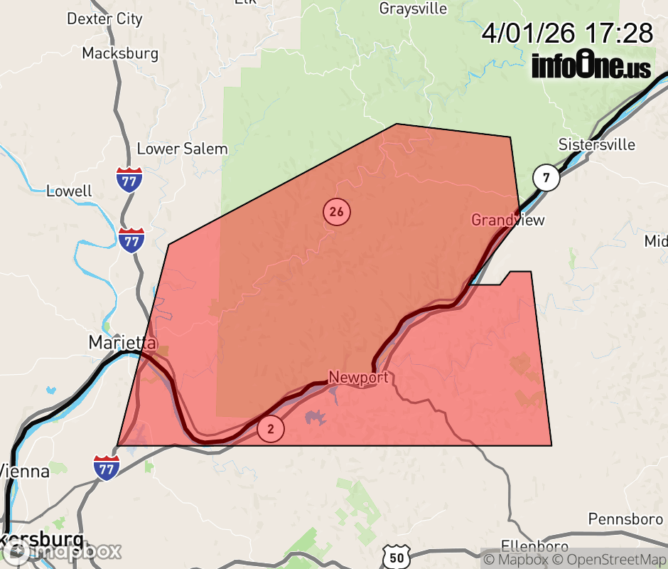 Canceled 4/1/26 5:45 PM Severe Thunderstorm Warning issued April 1 at 5:26PM EDT until April 1 at 5:45PM EDT by NWS Charleston WV At 526 PM EDT, a severe thunderstorm was located near Belmont, or near Marietta, moving east at 30 mph. HAZARD...Ping pong ball size hail and 60 mph wind gusts. SOURCE...Radar indicated. IMPACT...People and animals outdoors will be injured. Expect hail damage to roofs, siding, windows, and vehicles. Expect wind damage to roofs, siding, and trees. Locations impacted include... Marietta, St. Marys, Williamstown, Belmont, Newport, Matamoras, Arvilla, Point Lookout, Willow Island, Maxwell, and New Matamoras. ![]() |