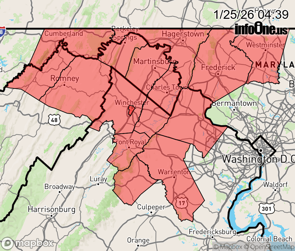 Canceled 1/25/26 12:20 PM Winter Storm Warning issued January 25 at 4:37AM EST until January 26 at 4:00AM EST by NWS Baltimore MD/Washington DC ...MAJOR WINTER STORM WILL IMPACT THE REGION THROUGH SUNDAY EVENING... .A large area of precipitation will overrun Arctic air in place over the Mid-Atlantic. This will lead to widespread significant snow, with the potential for ice today especially south of Highway 50 and near and east of Interstate 95. In addition to the high threat for significant snow and ice, very cold temperatures are expected tonight through the middle of next week with sub-zero wind chills likely at times. * WHAT... Heavy mixed precipitation expected. Total snow and sleet accumulations between 10 and 14 inches, with up to 18 inches possible near the Mason-Dixon line. Ice accumulations up to a tenth of an inch, mainly across the northern Shenandoah Valley. * WHERE... Portions of north central and western Maryland, northern and northwest Virginia, and eastern and panhandle West Virginia. * WHEN... Until 4 AM EST Monday. * IMPACTS... Travel could be very difficult. * ADDITIONAL DETAILS... Snow will continue this morning, becoming heavy at times with rates of around one inch per hour possible at times. A mix with sleet or freezing rain is expected later this morning and into the afternoon. Visibility of one-quarter mile or less is possible at times. A prolonged period of very cold wind chills continues this evening and lasting through the middle of next week. ![]() |