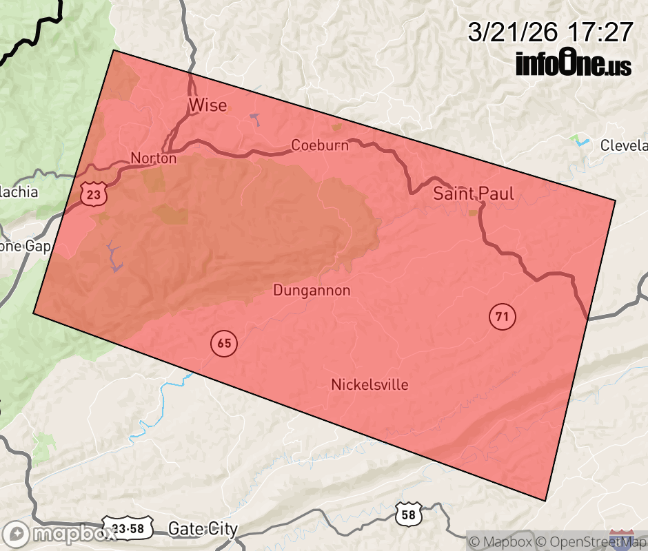 Canceled 3/21/26 6:00 PM Special Weather Statement issued March 21 at 5:26PM EDT by NWS Morristown TN At 526 PM EDT, Doppler radar was tracking a strong thunderstorm near Norton, moving east at 35 mph. HAZARD...Winds in excess of 30 mph and nickel size hail. SOURCE...Radar indicated. IMPACT...Gusty winds could knock down tree limbs and blow around unsecured objects. Minor hail damage to vegetation is possible. Locations impacted include... Norton, Wise, Coeburn, St. Paul, Nickelsville, Dungannon, Collingwood, Castlewood, and Fort Blackmore. ![]() |