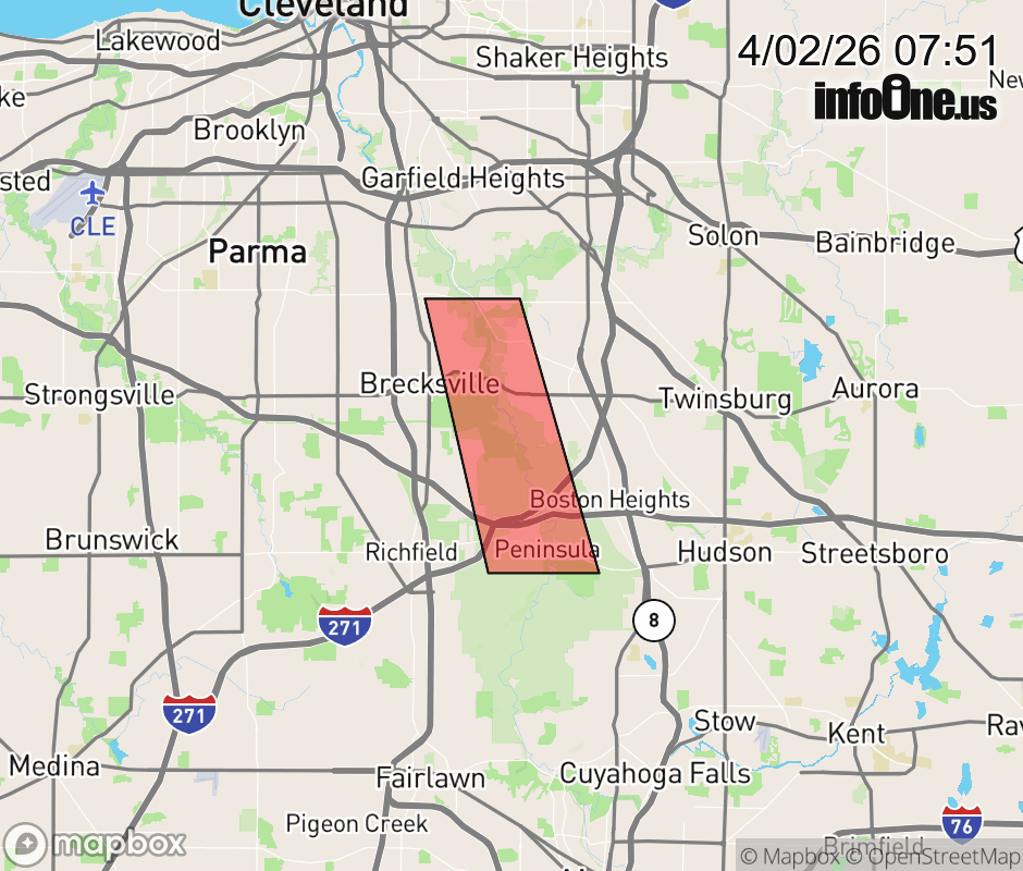 Canceled 4/2/26 10:44 AM Flood Warning issued April 2 at 7:50AM EDT until April 2 at 11:00PM EDT by NWS Cleveland OH ...The Flood Warning is extended for the following rivers in Ohio... Sandusky River At Tiffin affecting Seneca County. Huron River Near Milan affecting Erie County. Black River At Elyria affecting Lorain County. Mahoning River At Leavittsburg affecting Trumbull County. Mahoning River At Youngstown affecting Mahoning and Trumbull Counties. Eagle Creek Above Findlay affecting Hancock County. ...The Flood Warning continues for the following rivers in Ohio... Cuyahoga River At Jaite affecting Cuyahoga and Summit Counties. Blanchard River Near Findlay affecting Hancock County. Maumee River At Waterville affecting Wood and Lucas Counties. Killbuck Creek Near Killbuck affecting Wayne and Holmes Counties. Eagle Creek At Phalanx Station affecting Trumbull County. For the Sandusky River...including Upper Sandusky, Fremont, Tiffin, Bucyrus...Moderate flooding is forecast. For the Huron River...including Milan...Moderate flooding is forecast. For the Black River...including Elyria...Minor flooding is forecast. For the Cuyahoga River...including Hiram Rapids, Jaite, Old Portage, Independence...Minor flooding is forecast. For the Blanchard River...including Findlay...Minor flooding is forecast. For the Maumee River...including Grand Rapids, Waterville...Minor flooding is forecast. For the Killbuck Creek...including Killbuck...Minor flooding is forecast. For the Mahoning River...including Leavittsburg, Warren, Youngstown...Minor flooding is forecast. For the Eagle Creek (Hancock)...including Findlay...Moderate flooding is forecast. For the Eagle Creek (Trumbull)...including Phalanx Station...Minor flooding is forecast. * WHAT... Minor flooding is occurring and minor flooding is forecast. * WHERE... Cuyahoga River at Jaite. * WHEN... Until late this evening. * IMPACTS... At 12.0 feet, Vaughn Road flooded near the river with a foot or more of water over the roadway. * ADDITIONAL DETAILS... - At 7:15 AM EDT Thursday the stage was 12.0 feet. - Forecast...The river is expected to rise to a crest of 12.3 feet this morning. It will then fall below flood stage late this afternoon. - Flood stage is 12.0 feet. - Please visit www.weather.gov/safety/flood for flood safety and preparedness information. ![]() |