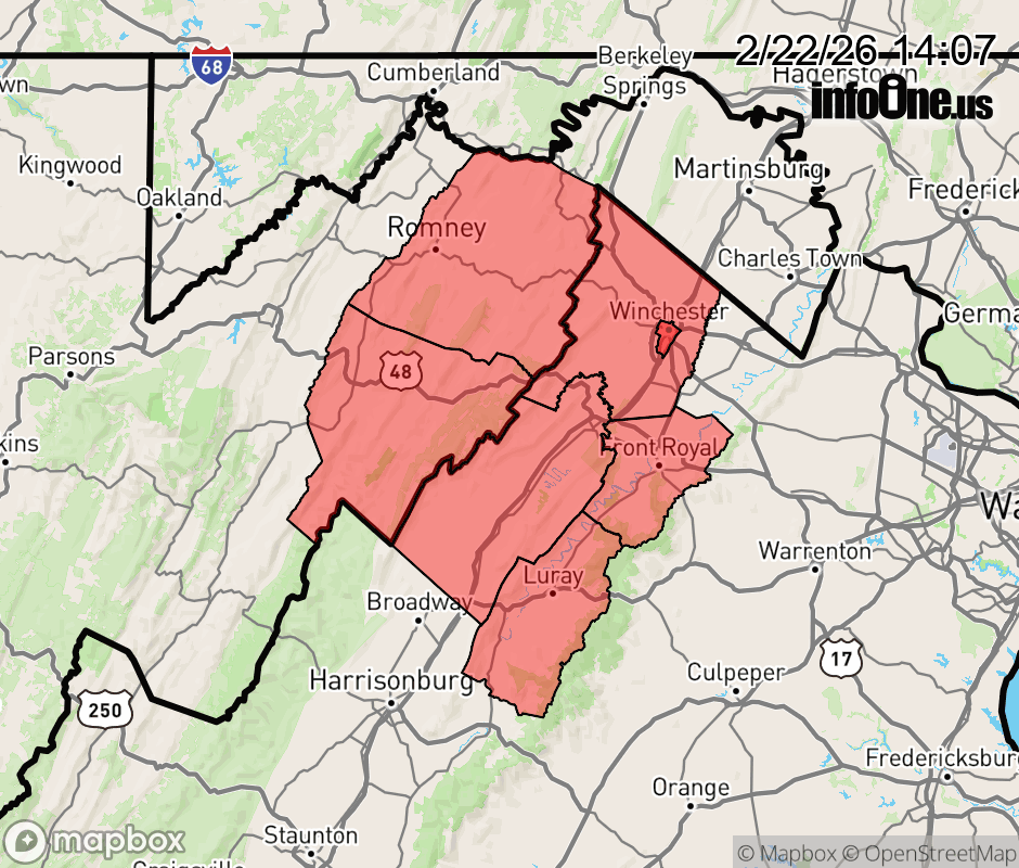 Canceled 2/22/26 8:51 PM Winter Weather Advisory issued February 22 at 2:06PM EST until February 23 at 7:00AM EST by NWS Baltimore MD/Washington DC * WHAT... Snow. Total snow accumulations ranging from a coating to an inch or two in the valleys with 3 to 6 inches along the ridges above 1,000 feet. Northwest winds gusting 30 to 45 mph overnight through Monday. * WHERE... Portions of northwest Virginia and eastern West Virginia. * WHEN... Until 7 AM EST Monday. * IMPACTS... Plan on slippery road conditions. The hazardous conditions will impact the Monday morning commute. Gusty winds could bring down tree branches. * ADDITIONAL DETAILS... The combination of falling snow and blowing snow may cause visibility to drop below one-half mile at times tonight into early Monday, especially along the ridges above 1,000 feet. ![]() |