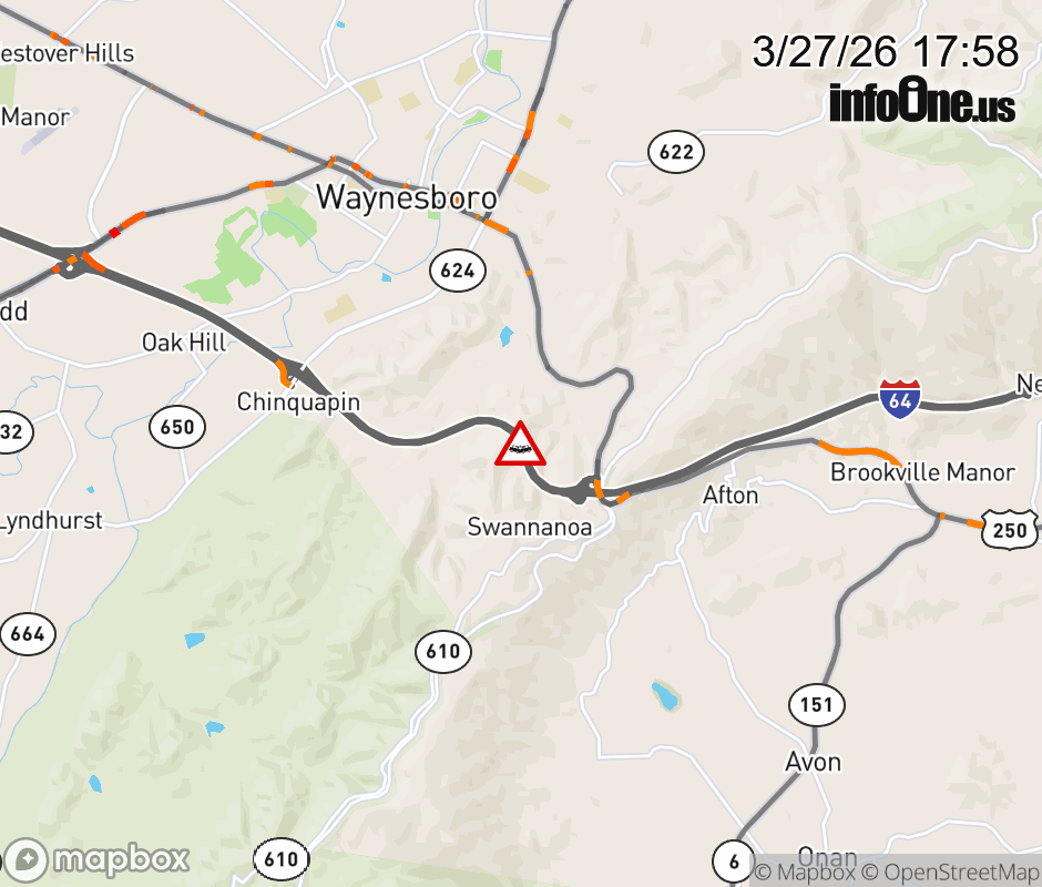 On I-64 at mile marker 99 in the County of Augusta, motorists can expect delays due to a vehicle crash. The east right shoulder is closed. Updated: Fri 3/27/26 5:58 PM EDT ![]() Updated: Fri 3/27/26 5:58 PM EDT |