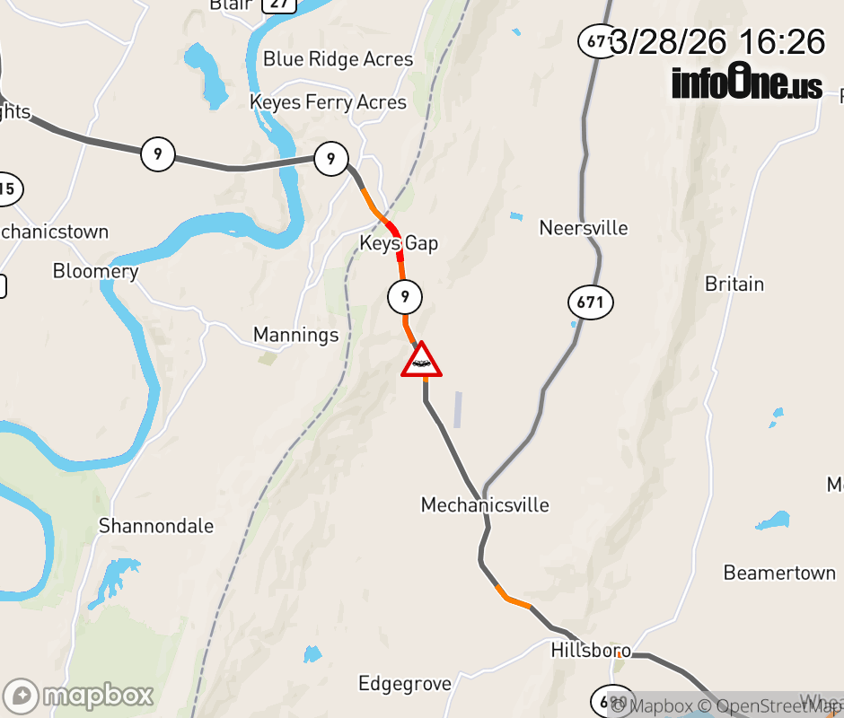 On VA-9 in the County of Loudoun, in the vicinity of Sagle Rd; Rt. 687E/W (Loudoun County), motorists can expect delays due to a vehicle crash. All east lanes are alternating closures. All west lanes are alternating closures. Updated: Sat 3/28/26 4:26 PM EDT ![]() Updated: Sat 3/28/26 4:26 PM EDT |