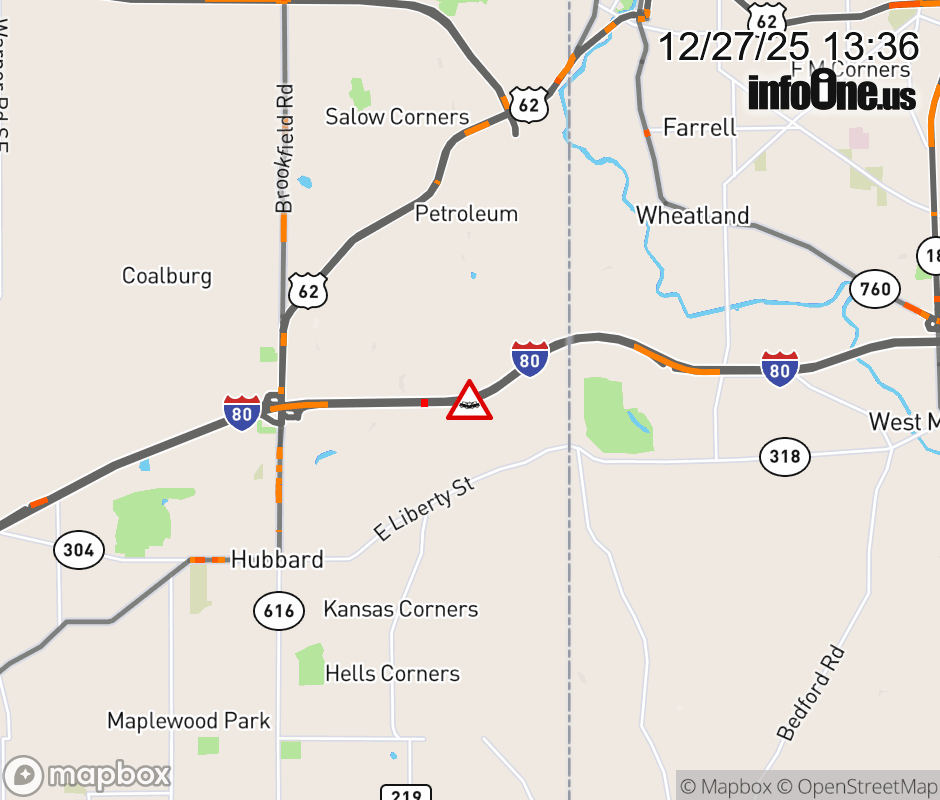 The right lane is blocked on I-80 East beyond US-62 East/SR-7 North/Sharon Pa, due to a crash. Updated: Sat 12/27/25 1:36 PM EST ![]() Updated: Sat 12/27/25 1:36 PM EST |