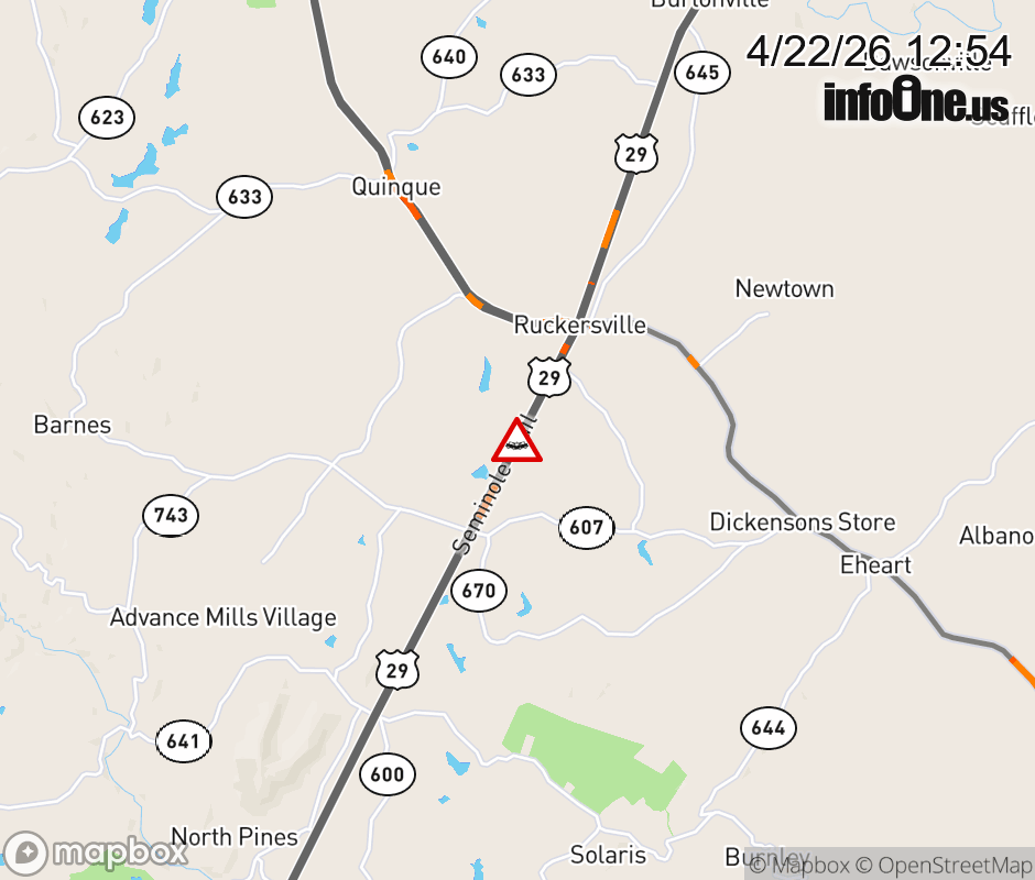 On US-29 North in the County of Greene, in the vicinity of Deane Rd; Rt. 600N/S (Greene County), motorists can expect delays due to a tractor trailer crash. Updated: Wed 4/22/26 12:54 PM EDT ![]() Updated: Wed 4/22/26 12:54 PM EDT |
