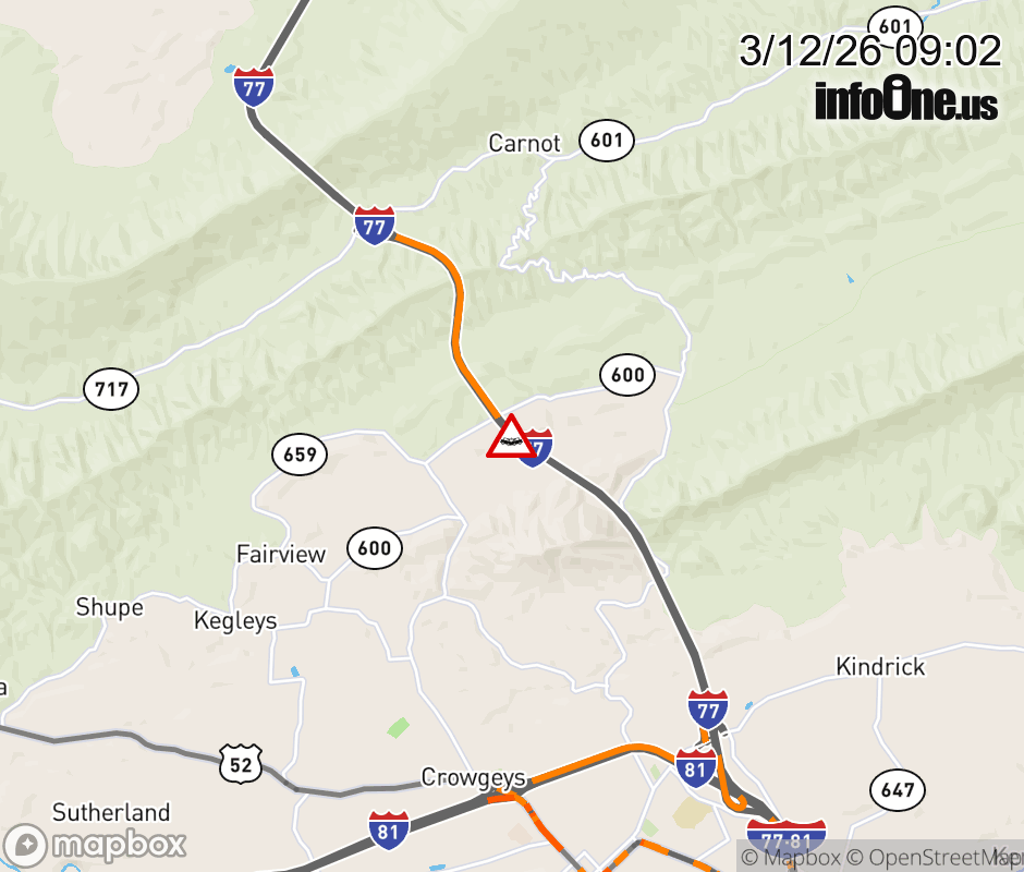 On I-77 South at mile marker 45 in the County of Wythe, motorists can expect delays due to a vehicle crash. Updated: Thu 3/12/26 9:02 AM EDT ![]() Updated: Thu 3/12/26 9:02 AM EDT |