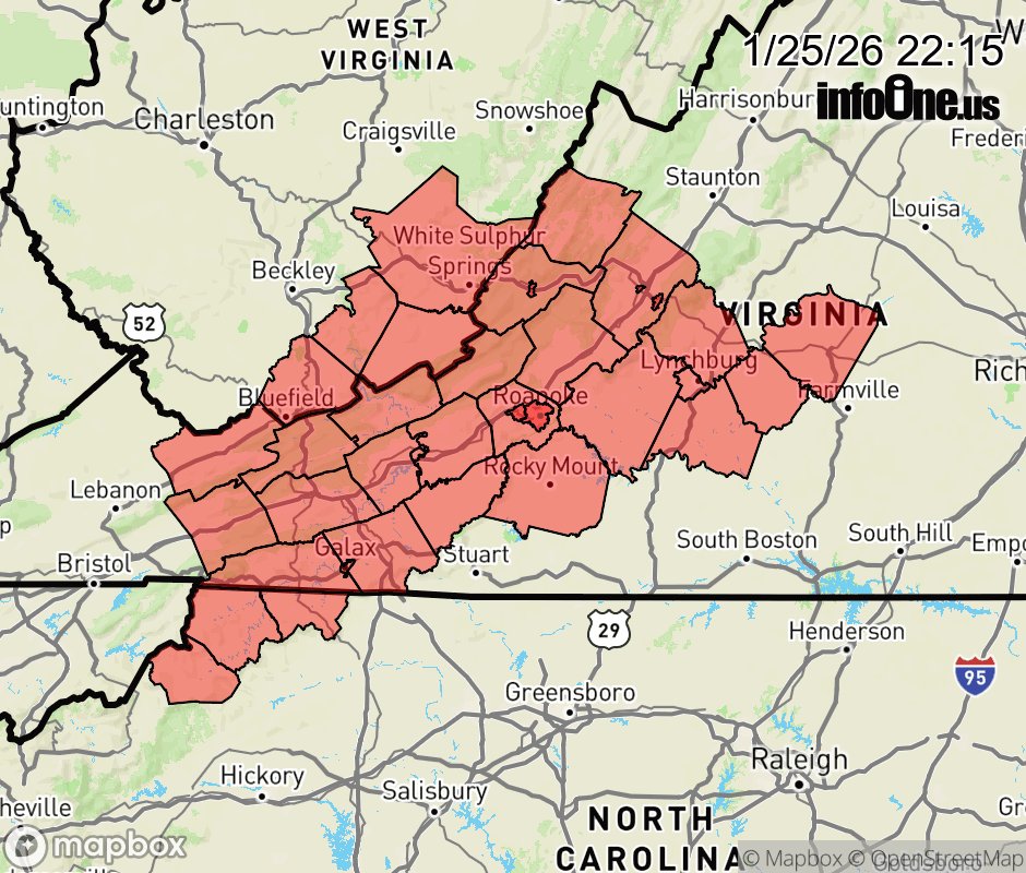 Extreme Cold Watch issued January 25 at 10:14PM EST until January 27 at 12:00PM EST by NWS Blacksburg VA * WHAT... Dangerously cold wind chills as low as 16 below possible. * WHERE... Portions of northwest North Carolina, central, south central, southwest, and west central Virginia, and southeast West Virginia. * WHEN... From Monday evening through Tuesday morning. * IMPACTS... The cold wind chills as low as 15 below zero could result in hypothermia or frostbite if precautions are not taken. Frostbite and hypothermia will occur if unprotected skin is exposed to these temperatures. ![]() |
