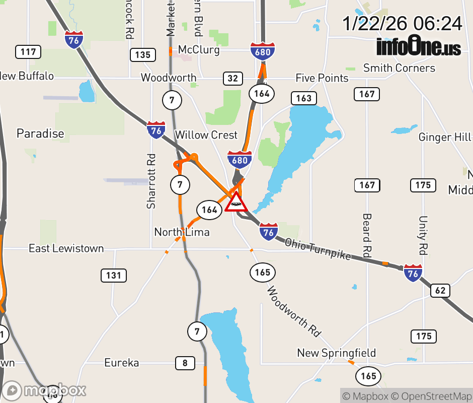 Expect lane closures on I-76 West (Ohio Turnpike) beyond I-680 North, due to a crash. ![]() |