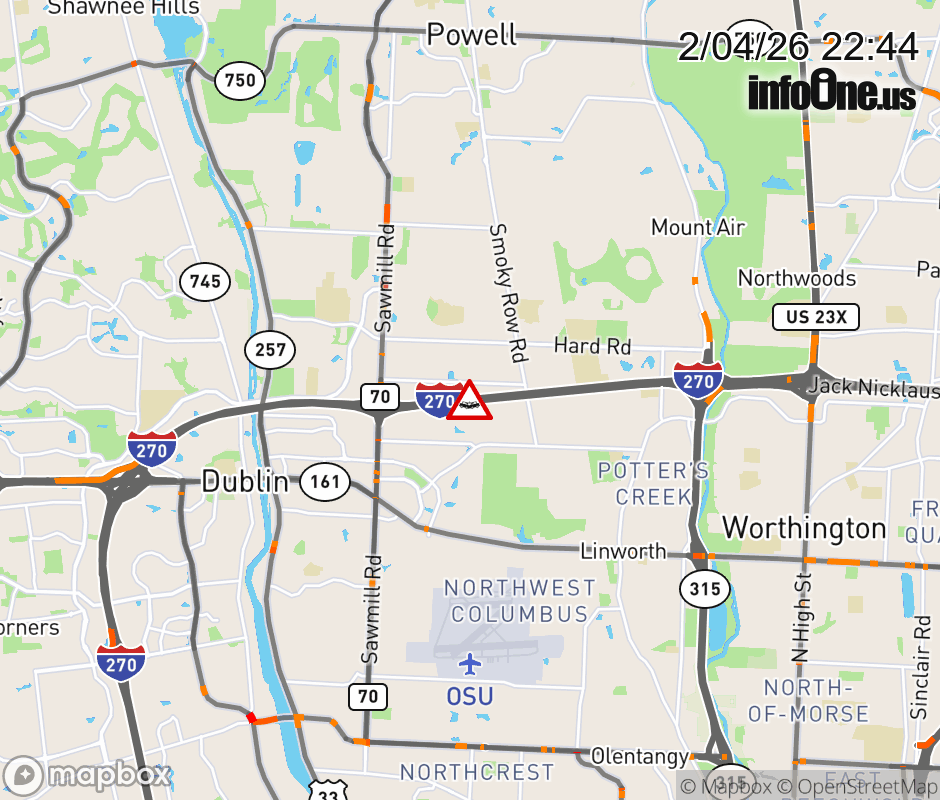 The 2 right lanes are blocked on I-270 West beyond SR-315 South, due to a crash. Updated: Wed 2/4/26 10:44 PM EST ![]() Updated: Wed 2/4/26 10:44 PM EST |
