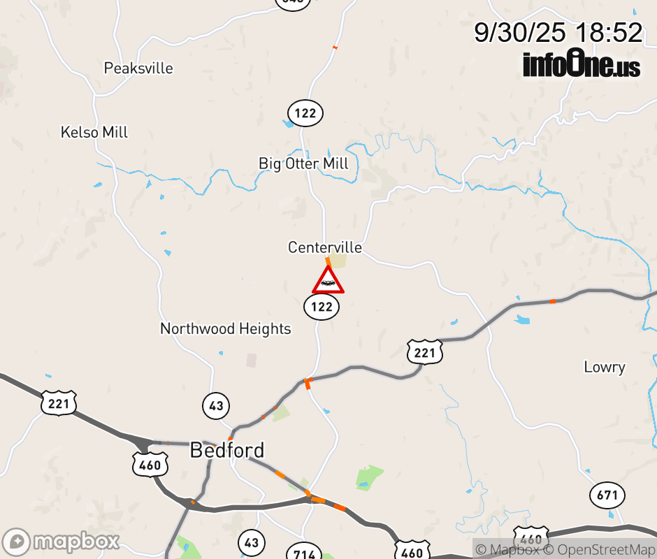 On VA-122 North in the County of Bedford, in the vicinity of Liberty Minutemen Dr; Rt. 9855E/W (Bedford County), motorists can expect delays due to a vehicle crash. Lane closures exist. ![]() |