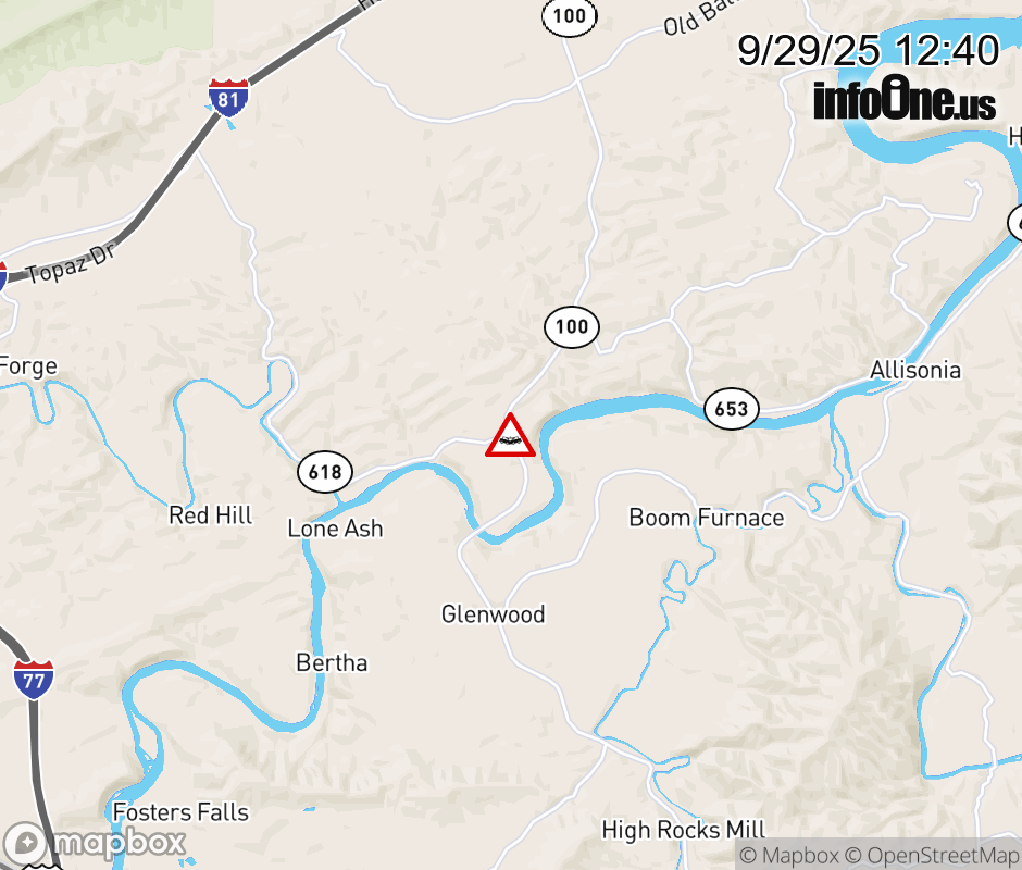 On VA-100 in the County of Wythe, in the vicinity of Reed Creek Dr; Rt. 618N/S (Wythe County), motorists can expect delays due to a vehicle crash. All north lanes are closed. All south lanes are closed. ![]() |