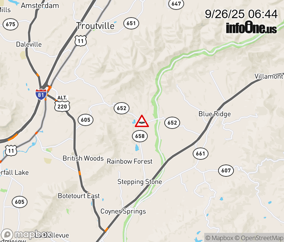 On Rt. 658 North in the County of Botetourt, in the vicinity of Mountain Pass Rd; Rt. 652E/W (Botetourt County), motorists can expect delays due to a vehicle crash. Lane closures exist. ![]() |