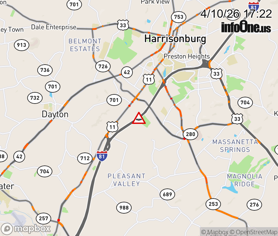 On I-81 at mile marker 244.6 in the County of Rockingham, motorists can expect delays due to a vehicle crash. The north right shoulder is closed. Updated: Fri 4/10/26 5:22 PM EDT ![]() Updated: Fri 4/10/26 5:22 PM EDT |