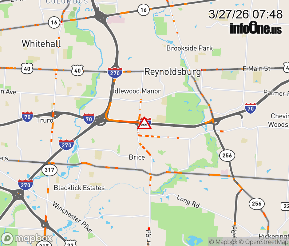 The 2 left lanes are blocked on I-70 West at Brice Rd, due to a disabled vehicle. Updated: Fri 3/27/26 7:48 AM EDT ![]() Updated: Fri 3/27/26 7:48 AM EDT |