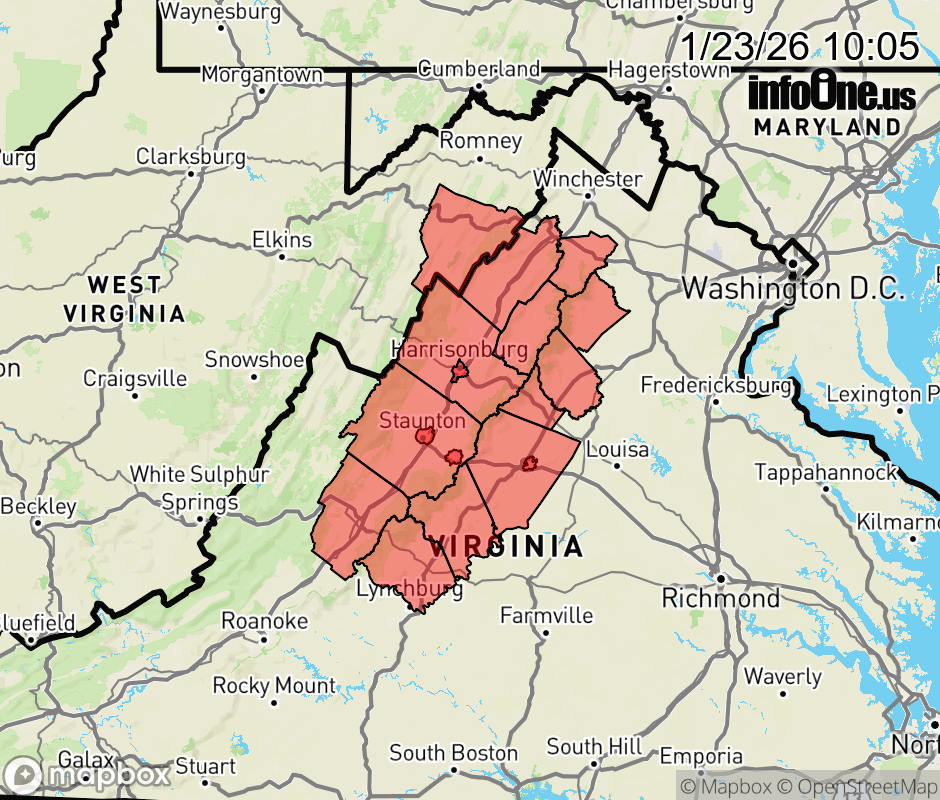 Canceled 1/23/26 5:18 PM Winter Storm Warning issued January 23 at 10:03AM EST until January 26 at 1:00AM EST by NWS Baltimore MD/Washington DC * WHAT... Heavy mixed precipitation expected. Total snow and sleet accumulations between 8 and 14 inches, with highest amounts west of the Blue Ridge and especially into eastern WV. Ice accumulations of one to two tenths, mainly south of US-33, and up to one quarter inch of ice accumulation is possible along the Blue Ridge. * WHERE... Portions of central, northwest, and western Virginia and eastern West Virginia. * WHEN... From 7 PM Saturday to 1 AM EST Monday. * IMPACTS... Power outages and tree damage are likely due to the ice. Travel could be nearly impossible. * ADDITIONAL DETAILS... Snow will likely overspread the area by Saturday night, becoming heavy at times with rates of one to two inches per hour possible at times. A mix with sleet or freezing rain is expected Sunday, especially south of Interstate 70. Significant icing is possible especially across central Virginia. Visibility of one-quarter mile or less is possible at times. A prolonged period wind chills in the teens and single digits is likely beginning this evening and lasting through the middle of next week, with sub-zero wind chills possible at times. ![]() |