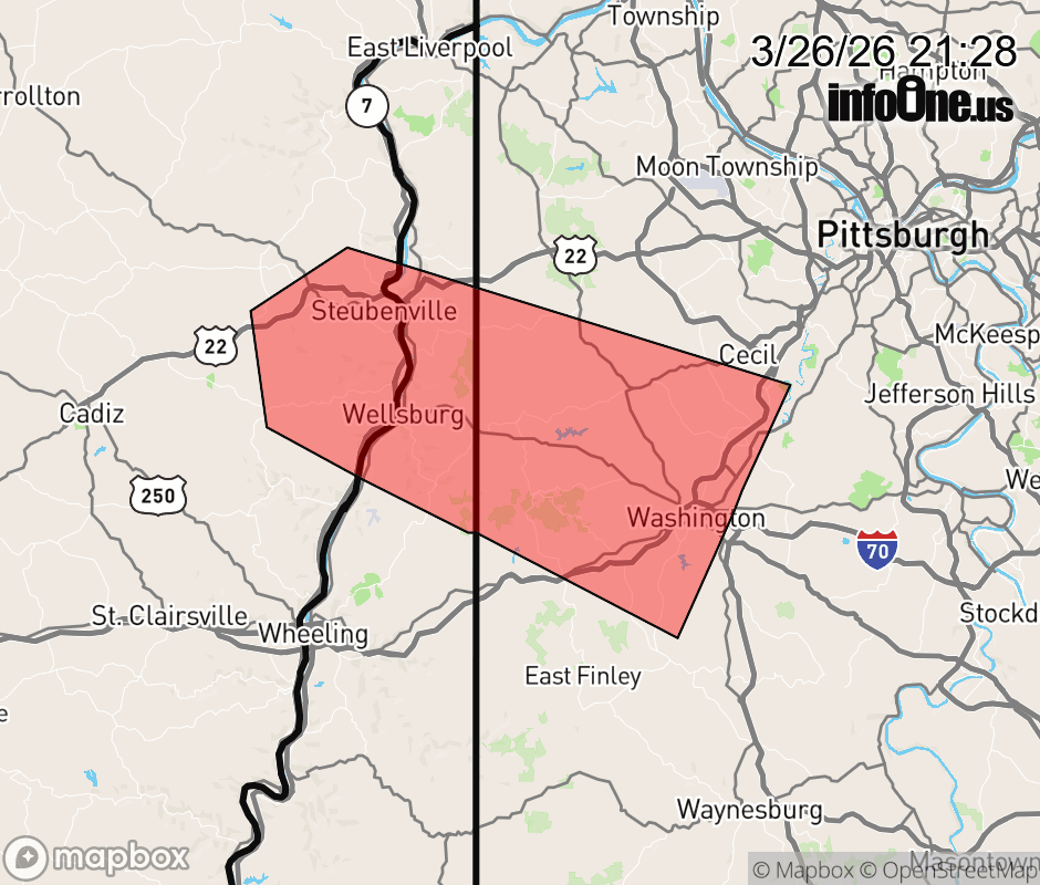 Canceled 3/26/26 9:36 PM Severe Thunderstorm Warning issued March 26 at 9:27PM EDT until March 26 at 10:00PM EDT by NWS Pittsburgh PA At 927 PM EDT, a severe thunderstorm was located over Steubenville, moving east at 55 mph. HAZARD...Ping pong ball size hail and 60 mph wind gusts. SOURCE...Radar indicated. IMPACT...People and animals outdoors will be injured. Expect hail damage to roofs, siding, windows, and vehicles. Expect wind damage to roofs, siding, and trees. Locations impacted include... Weirton, Steubenville, Washington, Canonsburg, Wellsburg, Avella, Cecil-Bishop, Wintersville, Mingo Junction, Follansbee, Wolfdale, McGovern, Hooverson Heights, East Washington, Houston, Bethany, Smithfield, Claysville, Franklin and Hickory. ![]() |