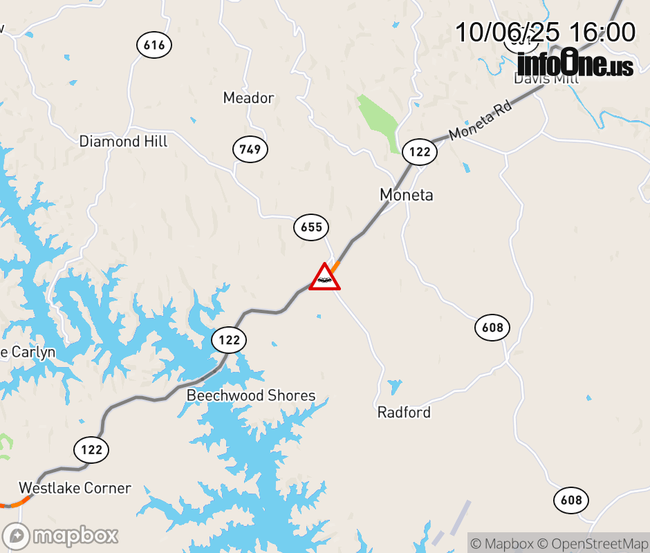On VA-122 North in the County of Bedford, in the vicinity of Hendricks Store Rd; Snug Harbor Trl; Rt. 655E/W (Bedford County); / HENDRICKS ST, motorists can expect delays due to a vehicle crash. Lane closures exist. ![]() |