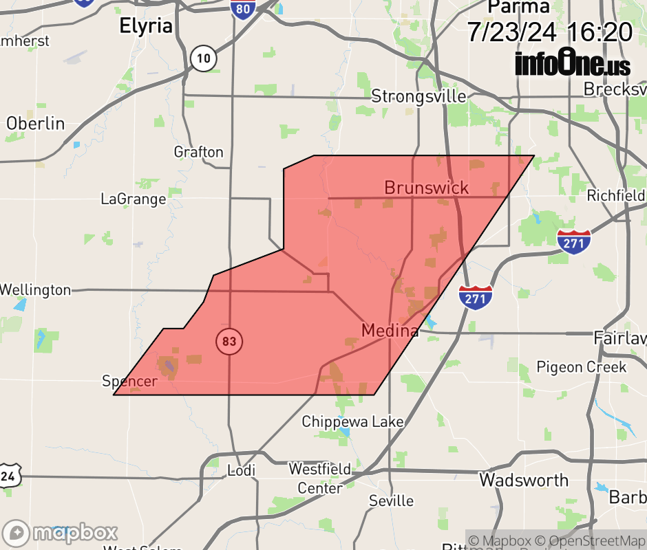 | Canceled 7/23/24 4:45 PM Special Weather Statement issued July 23 at 4:19PM EDT by NWS Cleveland OH At 419 PM EDT, Doppler radar was tracking strong thunderstorms along a line extending from near Brunswick to 6 miles north of Lodi. Movement was east at 20 mph. HAZARD...Wind gusts up to 40 mph. SOURCE...Radar indicated. IMPACT...Gusty winds could knock down tree limbs and blow around unsecured objects. Locations impacted include... Medina, Brunswick, Spencer, and Valley City.  | |||||||||