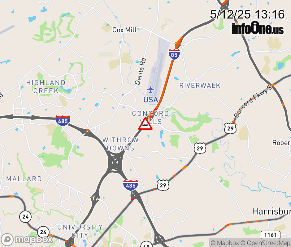 The left shoulder is closed at Exit 49 (Concord Mills Blvd.). Updated: Mon 5/12/25 1:16 PM EDT ![]() Updated: Mon 5/12/25 1:16 PM EDT |