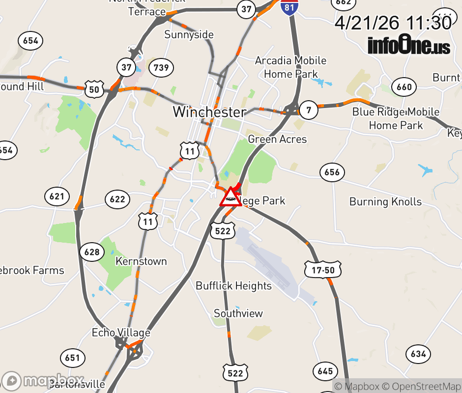 On US-50 in the County of Frederick, in the vicinity of the ramp to I-81S, motorists can expect delays due to a tractor trailer crash. All west lanes are closed. ![]() |
