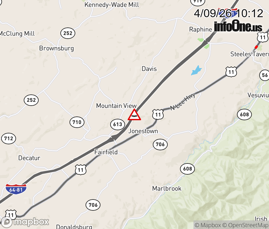 On I-81 at mile marker 201.7 in the County of Rockbridge, motorists can expect delays due to a tractor trailer crash. The north right shoulder is closed. ![]() |