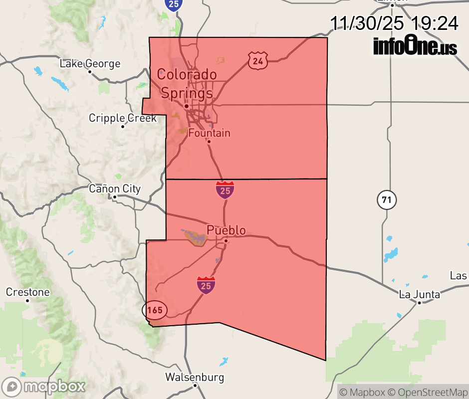 Canceled 11/30/25 7:30 PM Special Weather Statement issued November 30 at 5:20PM MST by NWS Pueblo CO Short range high resolution guidance indicates one or two snow bands are forecast to develop El Paso and Pueblo counties this evening. Although these bands will be localized, a quick inch or two of snow could occur under the heavier bands. Please use caution if traveling tonight. ![]() |