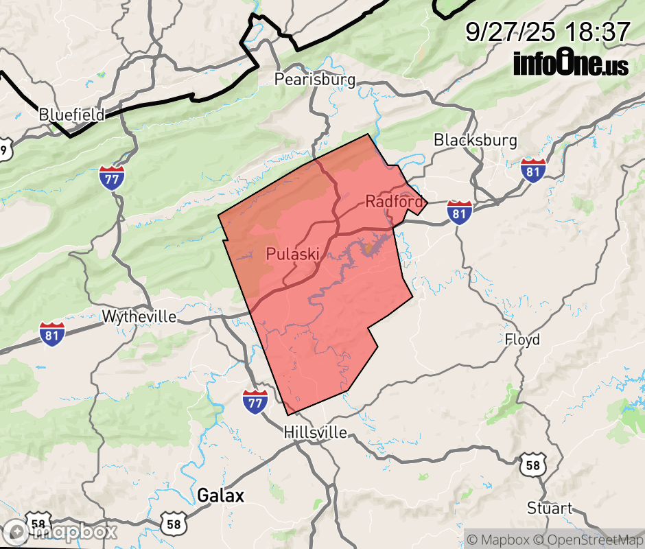 Canceled 9/27/25 8:53 PM Flood Advisory issued September 27 at 6:34PM EDT until September 27 at 9:45PM EDT by NWS Blacksburg VA * WHAT... Flooding caused by excessive rainfall is expected. * WHERE... A portion of southwest Virginia, including the following counties and independent city, Carroll, City of Radford, Pulaski and Wythe. * WHEN... Until 945 PM EDT. * IMPACTS... Minor flooding in low-lying and poor drainage areas. * ADDITIONAL DETAILS... - At 633 PM EDT, Doppler radar indicated heavy rain due to thunderstorms. Minor flooding is ongoing or expected to begin shortly in the advisory area. Between 1 and 2 inches of rain have fallen. - This includes the following streams and drainages... East Fork Indian Grave Creek, Big Macks Creek, Altoona Branch, Goose Creek, Back Creek, Brown Lick Branch, Crab Creek, Dry Branch, Connellys Run, Deepwater Creek, Carper Branch, Bentley Branch and Big Reed Island Creek. Additional rainfall amounts up to 1 inch are expected over the area. This additional rain will result in minor flooding. - Some locations that will experience flooding include... Radford... Pulaski... Dublin... Allisonia... Patterson... Draper... Claytor Lake State Park... - http://www.weather.gov/safety/flood ![]() |