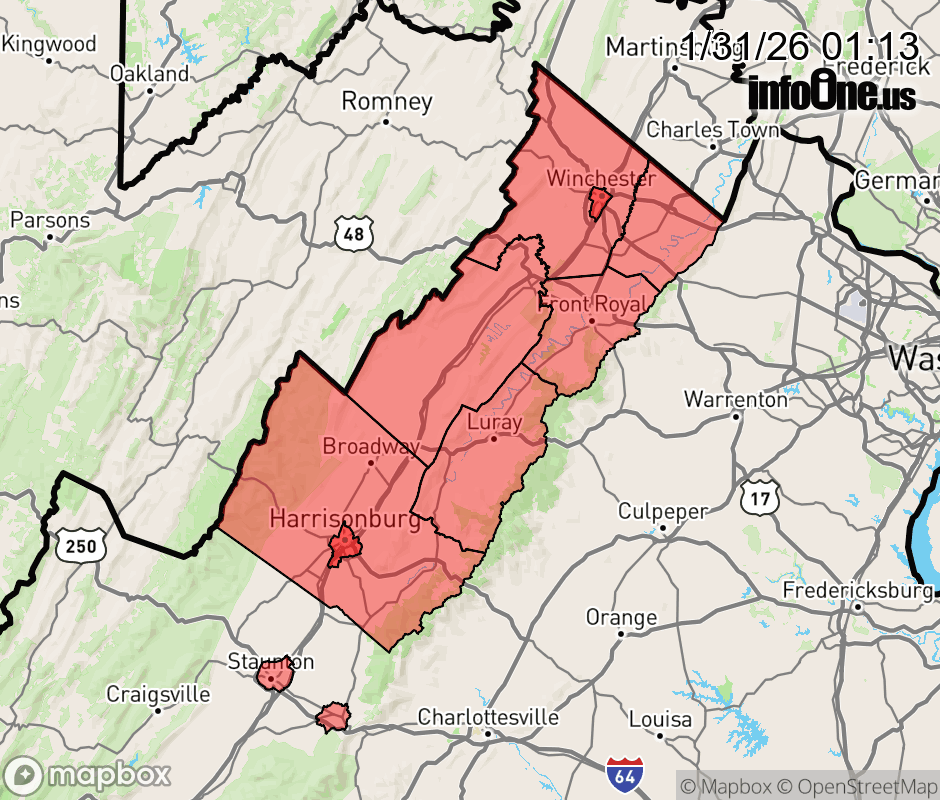 Cold Weather Advisory issued January 31 at 1:12AM EST until February 1 at 1:00PM EST by NWS Baltimore MD/Washington DC * WHAT... Bitter cold wind chills as low as 17 below expected. * WHERE... Clarke, Frederick VA, Page, Shenandoah, Warren, Augusta, and Rockingham Counties. * WHEN... From 10 PM this evening to 1 PM EST Sunday. * IMPACTS... The cold wind chills as low as 15 below zero could result in hypothermia or frostbite if precautions are not taken. ![]() |